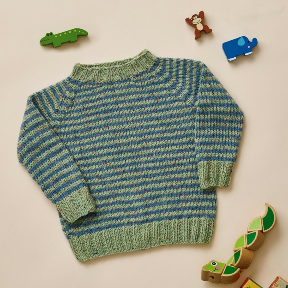 Barntröja med smala ränder 899327 är en tweedtröja med raglanärm. Garnet är Dagmar by Permin, ull och polyamid.