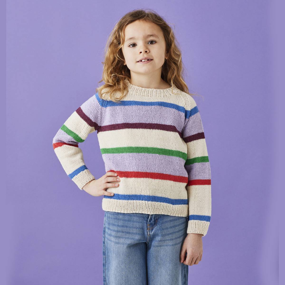 Barntröja randig med raglanärm 890212 är en tröja med färgglada ränder. Den är stickad i Berta by Permin. Det är ett garn i 55% ull och 45% bomull. Man stickar tröjan nerifrån och upp, runt, framstycken och bakstycken ihop. Ärmarna stickar man enskilt. Vid oket sätts alla delar på samma sticka och man stickar runt.