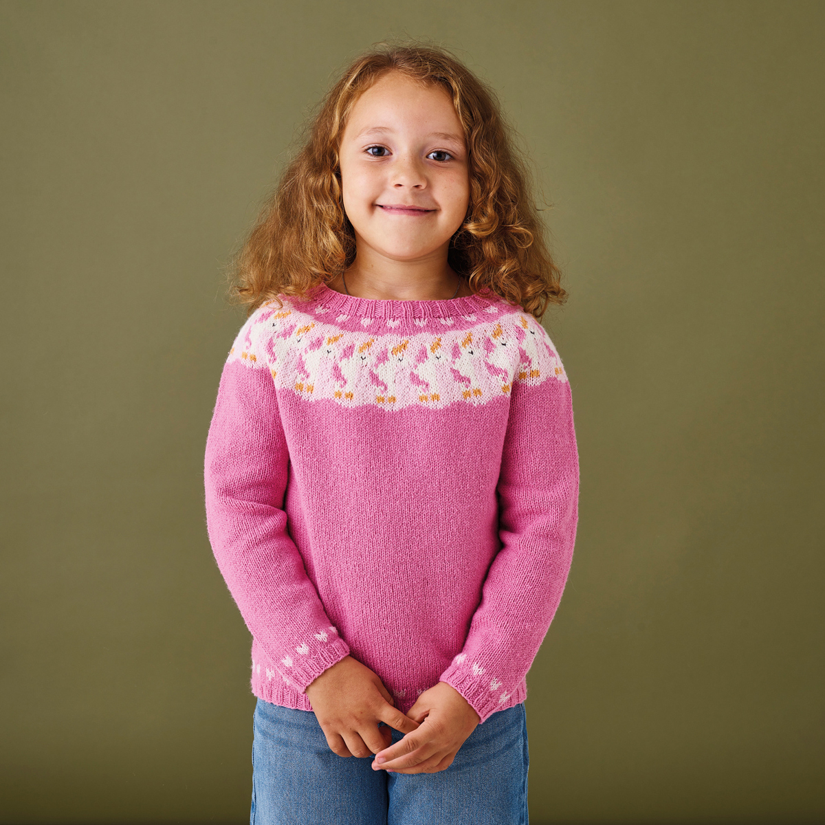 Enhörningströja, ett stickmönster med ett lite busigt motiv med enhörningar på oket och hjärtan på ärmkanterna. Tröjan stickar man nerifrån runt på rundstickor. Ärmarna stickar man för sig och vid oket sätter man alla delar på samma sticka och stickar tröjan runt. Garnet är Esther by Permin, ett garn i ull och bomull. Stickmönster finns i storlek 0 mån – 10 år.