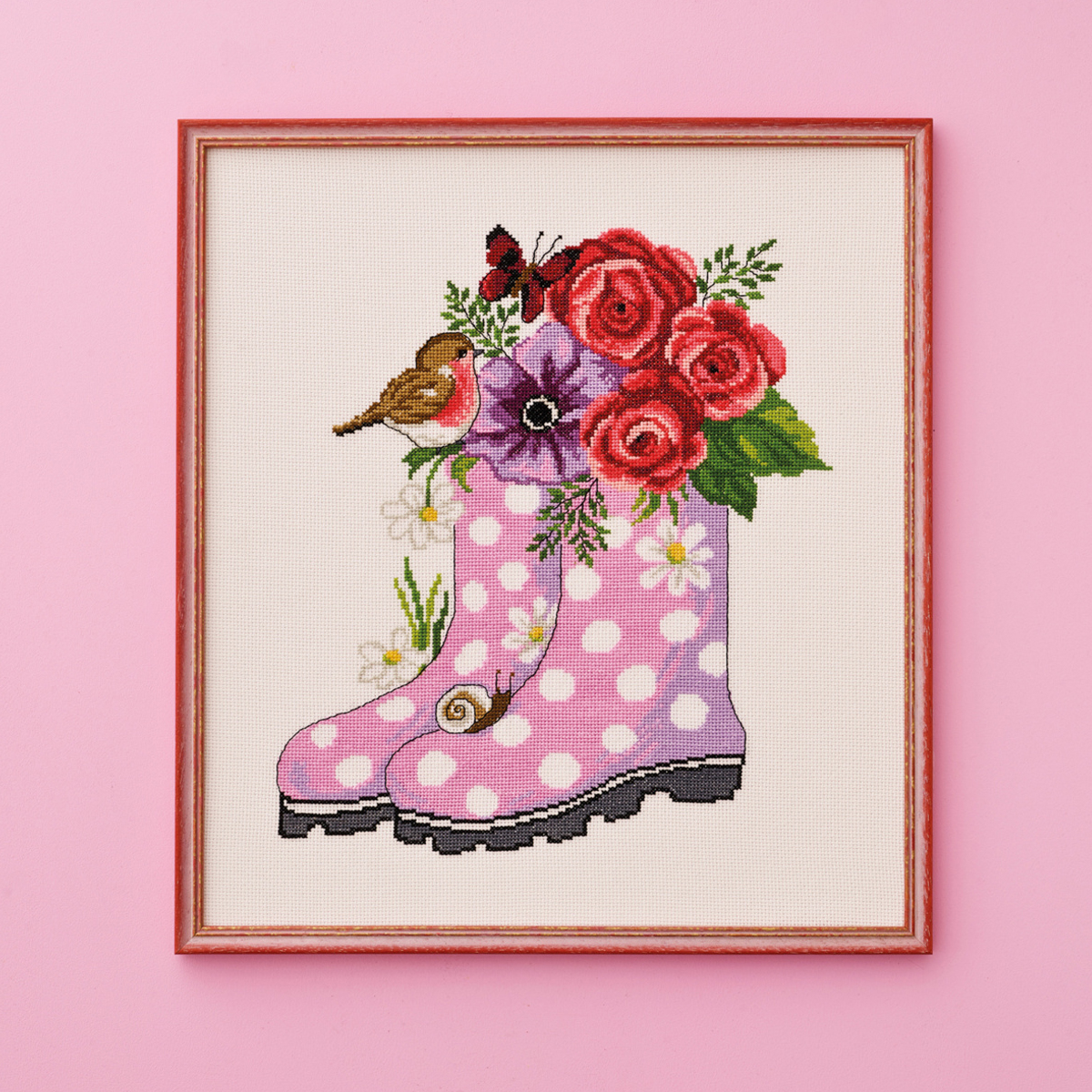 Korsstygnsbroderi Tavla Stövlarna. Det här broderiet föreställer ett par stöclar med blommor, snigel, fjäril och en fågel. Det är ett broderikit som innehåller vit aidaväv 100% bomull, 5,4 rutor/cm, moulinegarn, beskrivning och nål. Den broderas med räknade korsstygn och efterstygn.