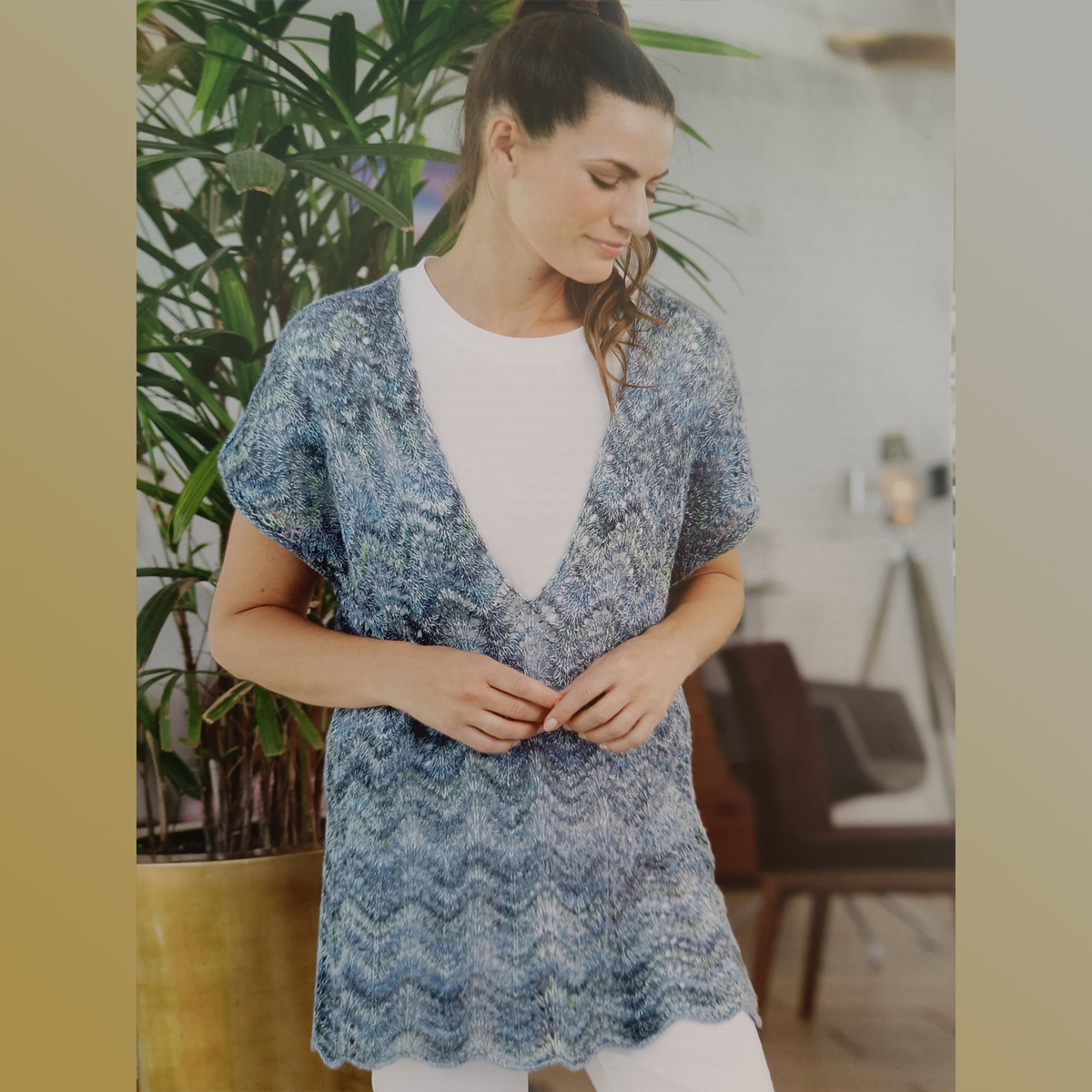Vågmönstrad tunika, ett stickmönster på en tunika som är stickad i Austermann Provence Color, ett garn i 72% bomull, 14% alpacka, 14 % ulll. Tunikan stickar du hela i mönsterstickning, delat i framstycke och bakstycke. Delarna syr du sen ihop. Stickmönstret finns i storlekarna dam 36/40, 42/46 och 48/52.