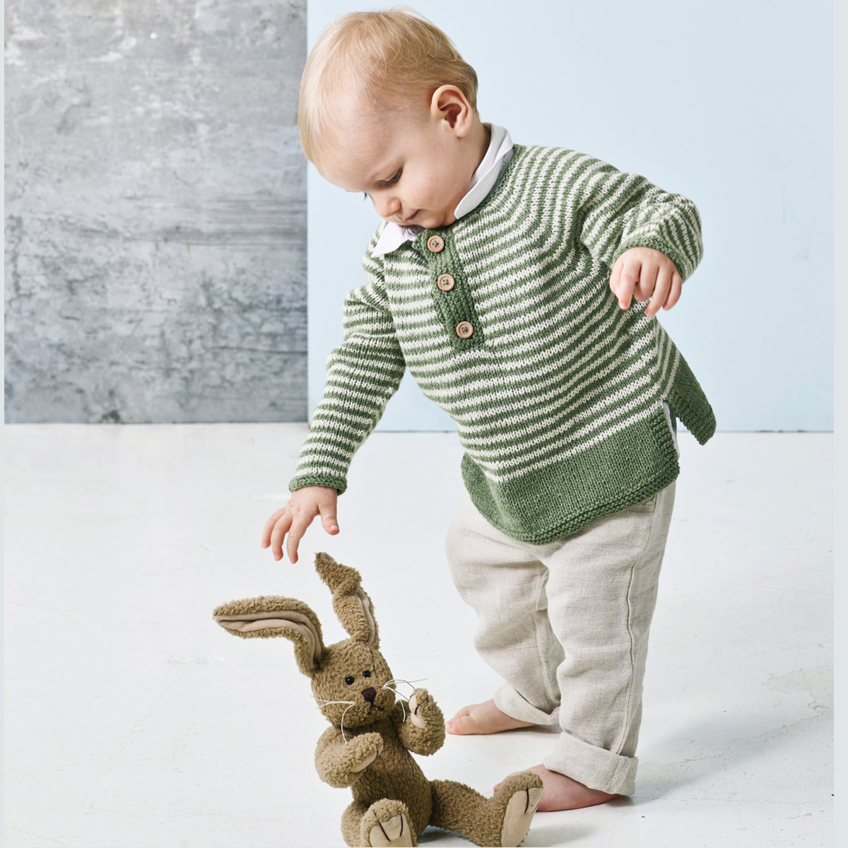 Randig babytröja med halsknäppning, ett stickmönster på en klassisk tröja med sin randning och rätstickade kanter. Man stickar tröjan i ett stycke uppifrån och ner. Stickmönstret är anpassat till garnet Luna by Permin, ett garn i återvunnen ull, 100% ull och rekommenderade stickor är 3 och 3,5 mm. Garnet tål maskintvätt ullprogram. Stickmönster finns i storlekar 1 – 24 månader.