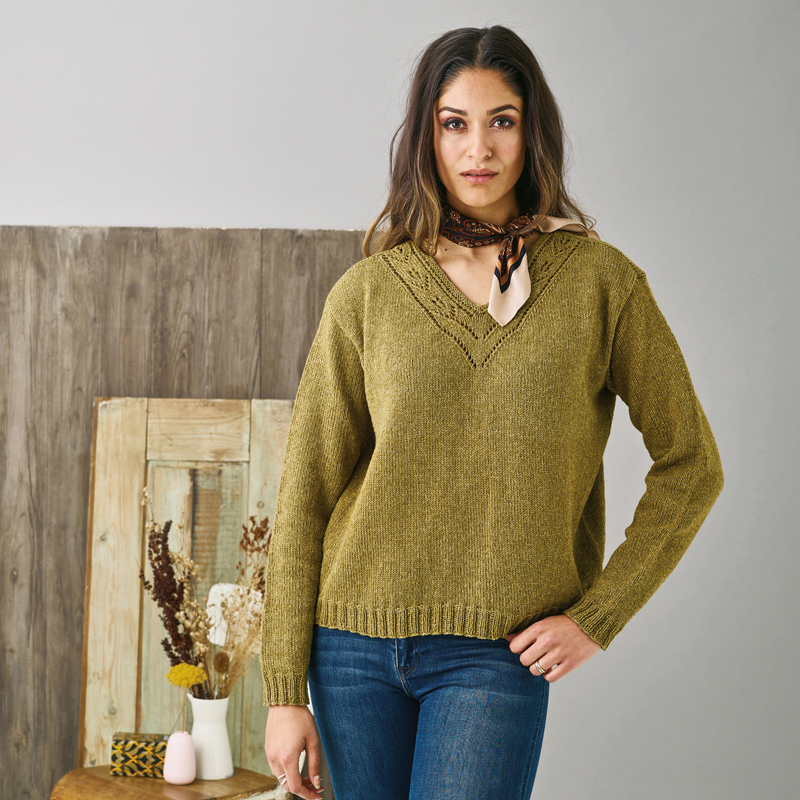 V-ringad tröja mönstrad halskant är en tröja som du kan sticka i Esther by Permin, vilket är ett garn i ull och bomull med stickor 3,5 mm eller des tickor du behöver för att få en masktäthet på 25 m på 10 cm.