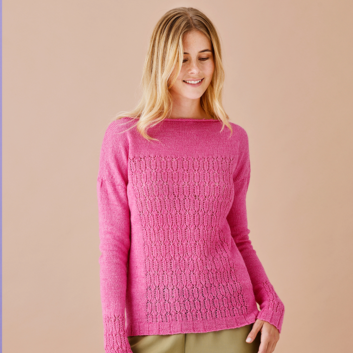 Jumper med hålmönster är ett stickmönstret som finns i storlekarna dam S – XL. Du stickar tröjan nerifrån i delade framtycke och bakstycke. Även ärmarna stickar du enskilt. Sen syr du ihop delarna. Mönstret beskriver tröjan stickad i Leonora by Permin, ett garn i silke, ull och mohair.