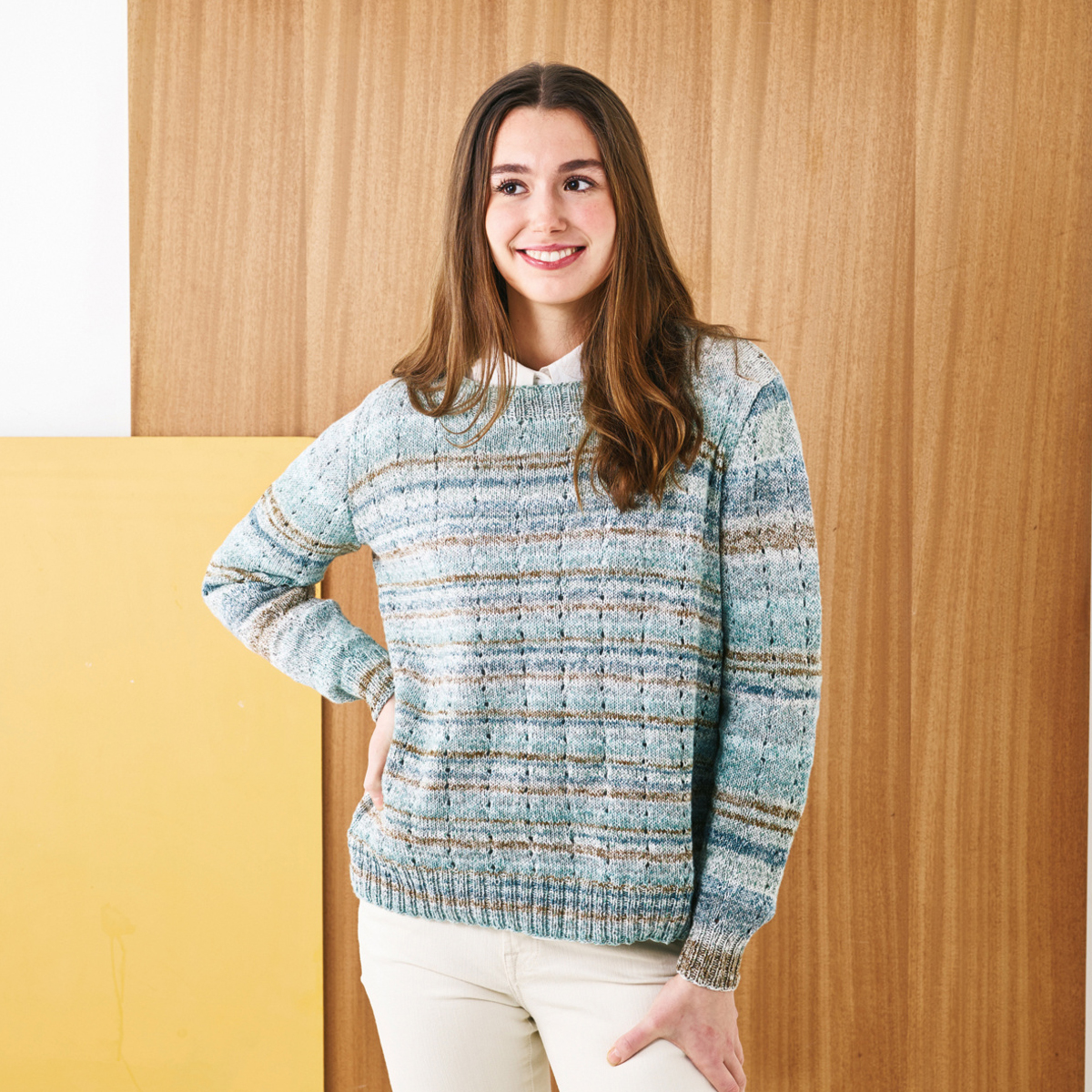 Damtröja med hålränder är ett stickmönster på en bomullströja i garnet Maja Color by Permin, ett bomullsgarn i mixade färger. Maja finns också som enfärgade nystan. Hela tröjan har diagonala ränder av hålmönster. Den här tröjan stickar man nerifrån och upp, runt på rundstickor ända upp till ärmhålet. Där delar man på arbetet så att man stickar varje framstycke och bakstycke för sig. Ärmarna stickar man för sig med en bekväm ärmkupa och syr sen fast dem. Kanter stickar man på efter att arbetet för övrigt är klart. Stickmönster finns i storlekar dam S – XL. Något rymlig passform.