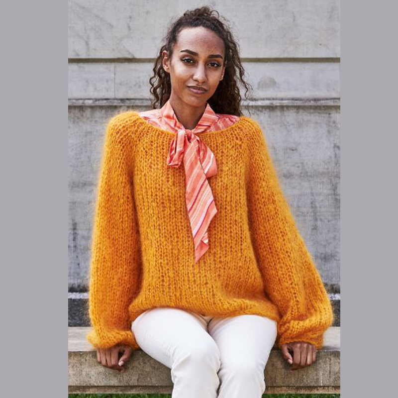 Mohairtröja med raglanärm, ett stickmönser på en tröja som man stickar i Bella by Permin. Det är ett garn i kid mohair, ull och polyamid. Tröjan är en enkel mohairtröja med raglanärm. Den stickar man med dubbelt garn uppifrån och ner, runt på rundstickor. Stickorna är grova och ger en tröja med grova maskor.