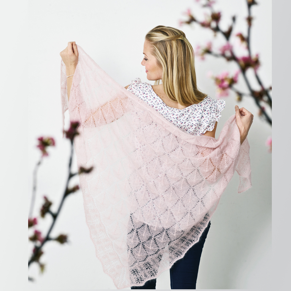 Trekantssjal i kid silk, ett stickmönster på en lätt och sirlig sjal stickad i kidsilk-garnet Angel by Permin. Sjalen är lätt och tunn och helt täckt med hålmönster. Man stickar sjalen fram och tillbaka på rundstickor till en trekant och sen plockar man upp maskor längs kanterna och stickar kanten efter att sjalen är stickad. Stickmönstret beskriver en sjal i storlek ca 80 x 160 cm. Till stickningen är stickor 4mm lämpliga.