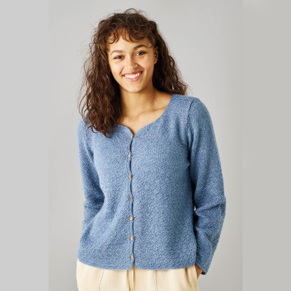 Stickmönster till v-ringad kofta med struktur, i garnet Leonora by Permin. Garnet Leonora är ett silkesgarn med silke, ull och mohair.