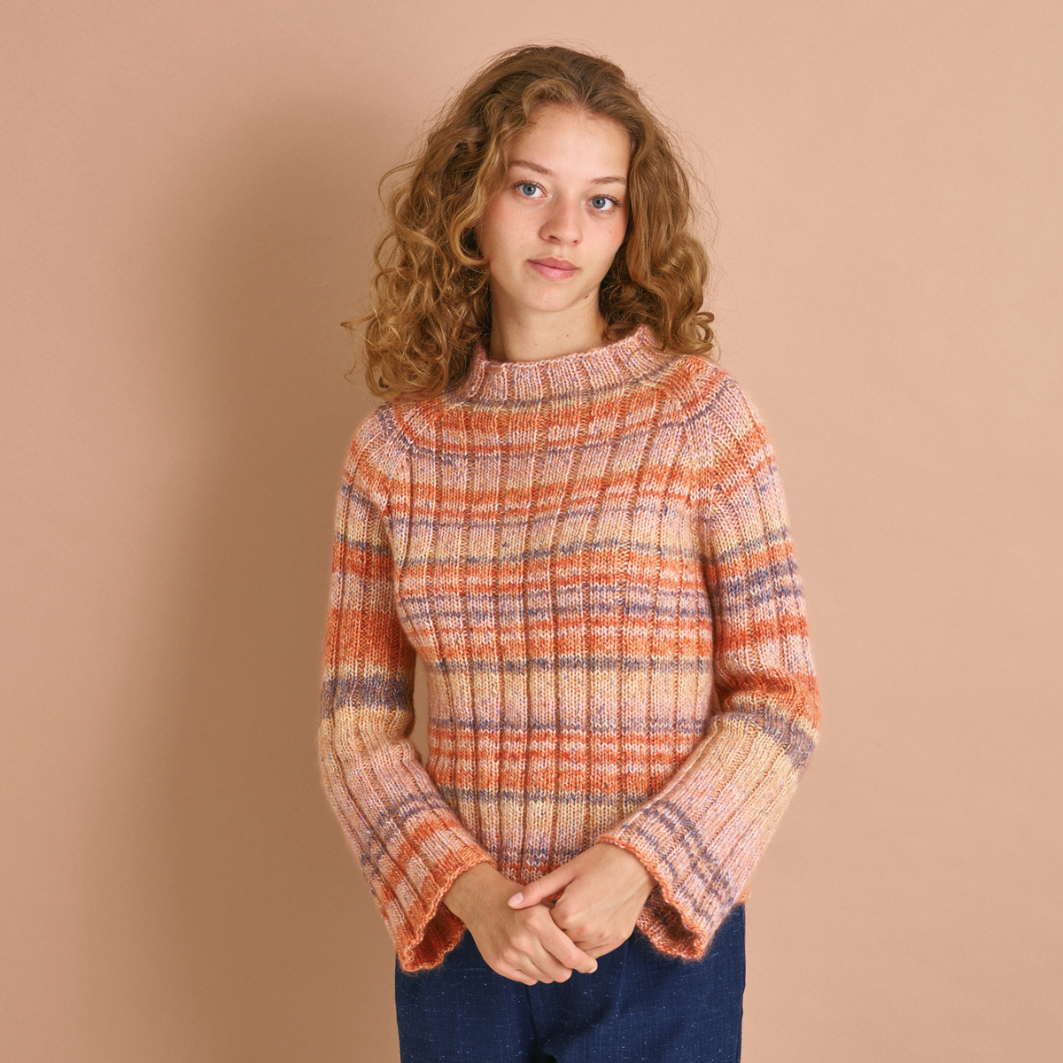 Tröja i Rigmor och Angel är ett stickmönster som beskriver en tröja med bred resår, stickad med två olika garner, Rigmor och Angel by Permin. Man stickar den runt på rundstickor nerifrån. Ärmarna stickar man för sig och vid oket sätter man ihop alla delar och stickar runt med raglanminskningar. Det är bred resår på hela tröjan. Stickbeskrivning finns i damstorlekar S – XXL. Bara en färg av garnet behövs, därför attt Rigmor skiftar i färg. Stickor 5mm.